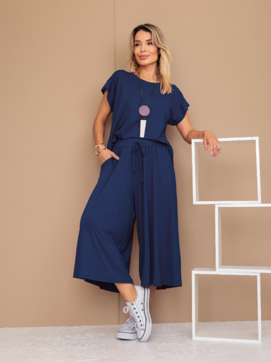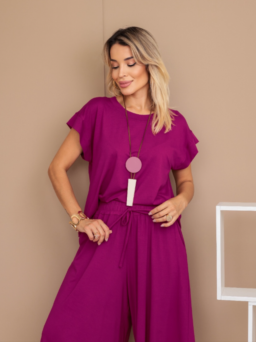 Composto por duas peças — uma blusa de caimento leve e uma calça pantacourt fluida —, ele é confeccionado em viscolycra, tecido de toque macio e elasticidade natural que valoriza o movimento e o bem-estar.